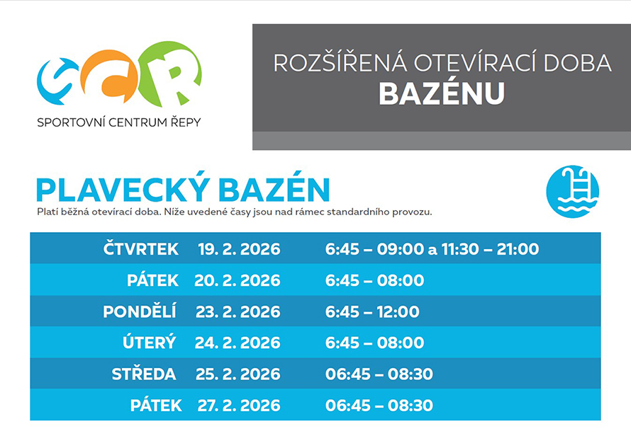 V uvedených dnech rozšiřujeme provoz bazénu nad rámec běžné otevírací doby.